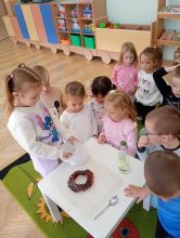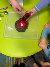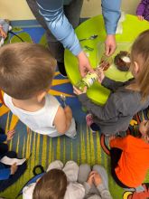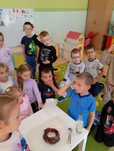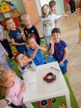 Podczas zajęć przedszkolaki, niczym prawdziwi naukowcy, przeprowadziły eksperyment z wykorzystaniem sody oczyszczonej i octu, obserwując spektakularną „erupcję wulkanu”.