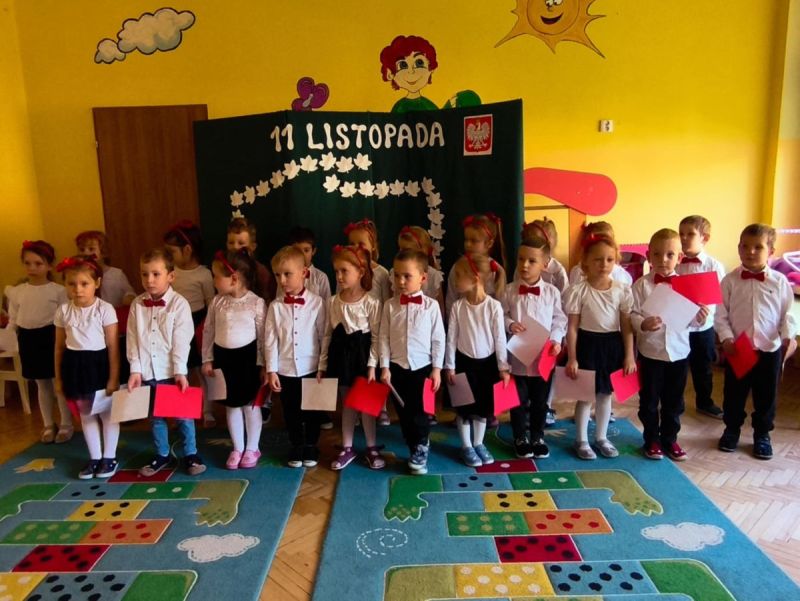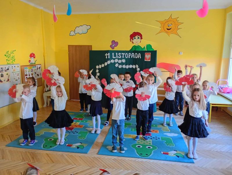 07.11.2025 r. w naszym przedszkolu odbyła się uroczysta akademia z okazji Narodowego Święta Niepodległości, podczas której dzieci z dumą wzięły udział w ogólnopolskiej akcji „Szkoła do hymnu”. O godzinie 11:11 wszystkie grupy przedszkolne wspólnie odśpiewały „Mazurek Dąbrowskiego”, oddając w ten sposób hołd bohaterom, którzy walczyli o wolność naszej Ojczyzny. Podczas uroczystości przedszkolaki zaprezentowały wiersze, piosenki i krótkie inscenizacje o tematyce patriotycznej. Dzieci z dumą wystąpiły w biało-czerwonych barwach, a sala wypełniła się symbolami narodowymi – flagami, kotylionami i godłem Polski.