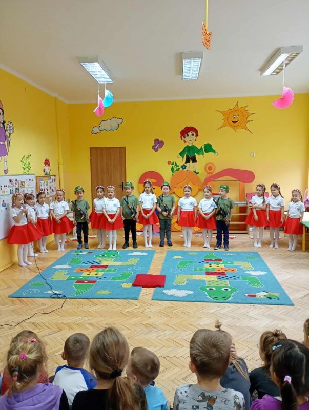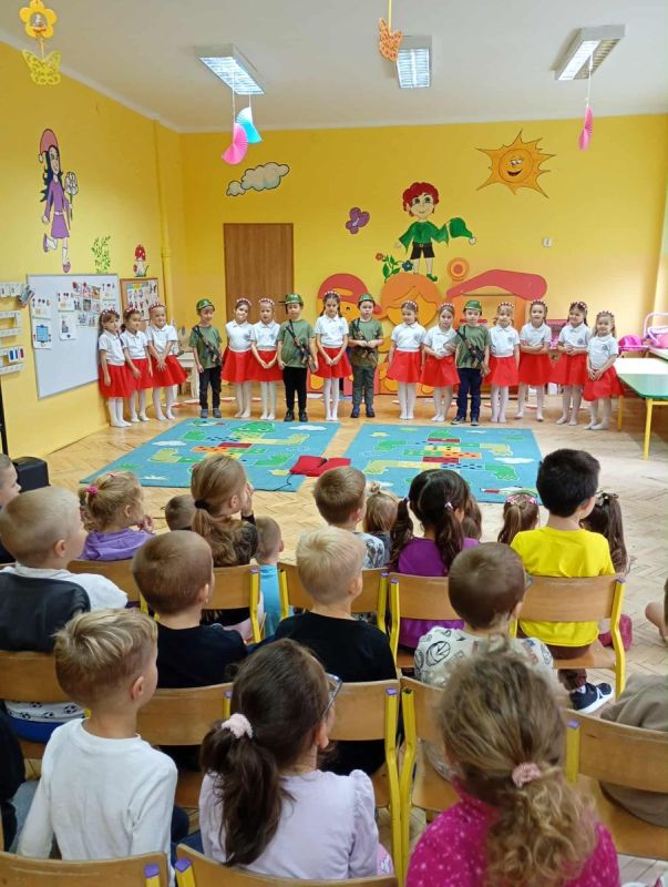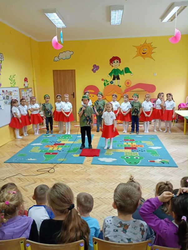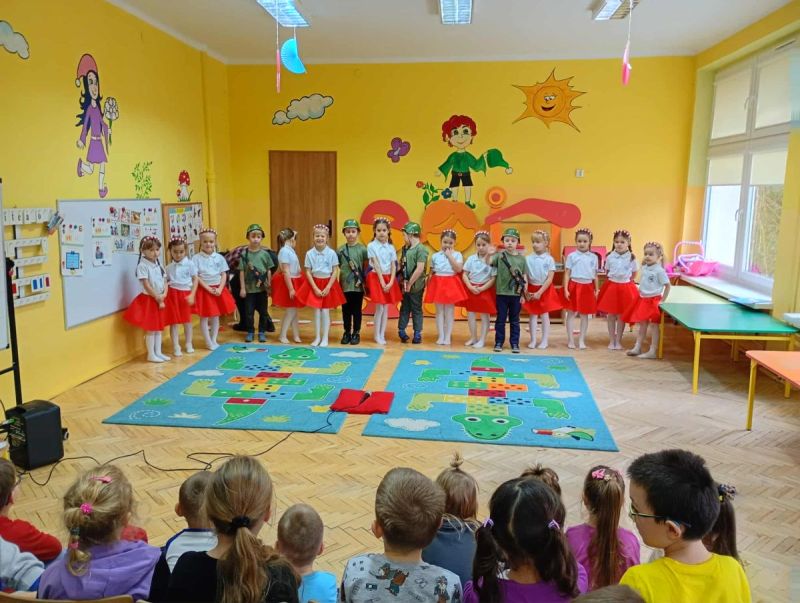 Z okazji Narodowego Święta Niepodległości nasze przedszkole odwiedzili uczniowie zerówki ze Szkoły Podstawowej nr 28 w Kielcach, którzy przygotowali piękną akademię patriotyczną dla dzieci z grup „Skrzaty” i „Puchatki”. Występ pełen był wierszy, piosenek i inscenizacji przypominających o ważnych wydarzeniach z historii Polski. Dzieci z ogromnym zaangażowaniem i powagą zaprezentowały swój program, a najmłodsi widzowie słuchali ich z zainteresowaniem i wzruszeniem.