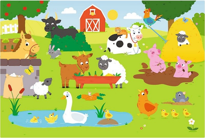 Dziecko liczy ile widzi świnek, owiec, kóz, kaczek, kaczątek, kur, kurczątek, owiec, koni, krów, byków itd. (Dziecko może policzyć wszystkie, lub wybrane zwierzęta danego rodzaju).