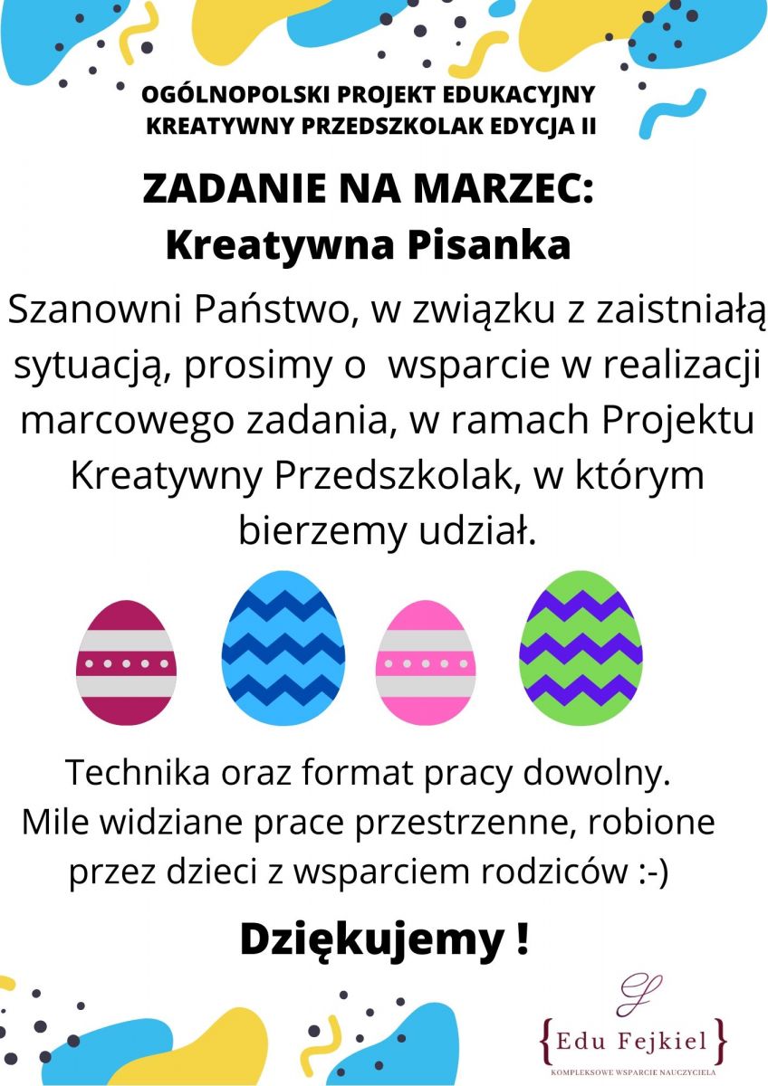 przypominamy o realizacji projektów "Kreatywny Przedszkolak"- Kreatywna pisanka oraz "Magiczna Moc Bajek"-Strach ma wielkie oczy. Chętne osoby, które wykonają zadania wysyłają fotorelacje na adres e-mail: katarzyna.zacharska91@gmail.com