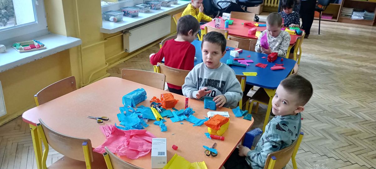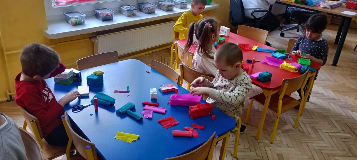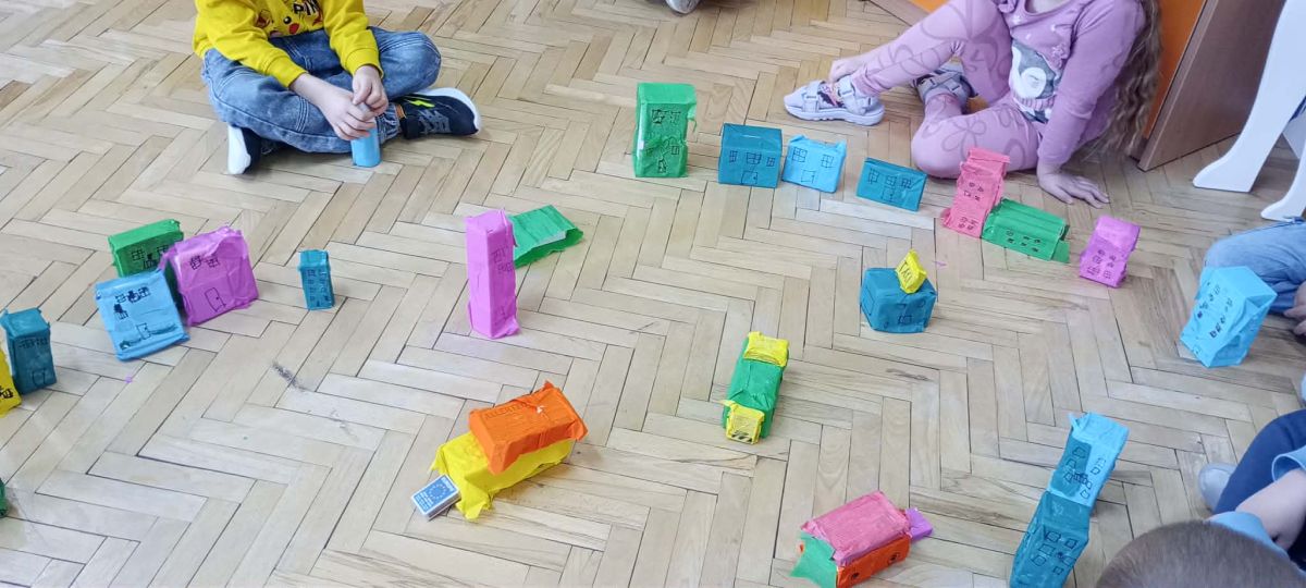 Podsumowaniem modułu było stworzenie makiety osiedla. Dzieci wykorzystywały różnorodne materiały, m.in. pudełka, kartony, bibułę, kolorowy papier i elementy dekoracyjne, tworząc domy, bloki, drogi, place zabaw oraz tereny zielone. Podczas pracy: